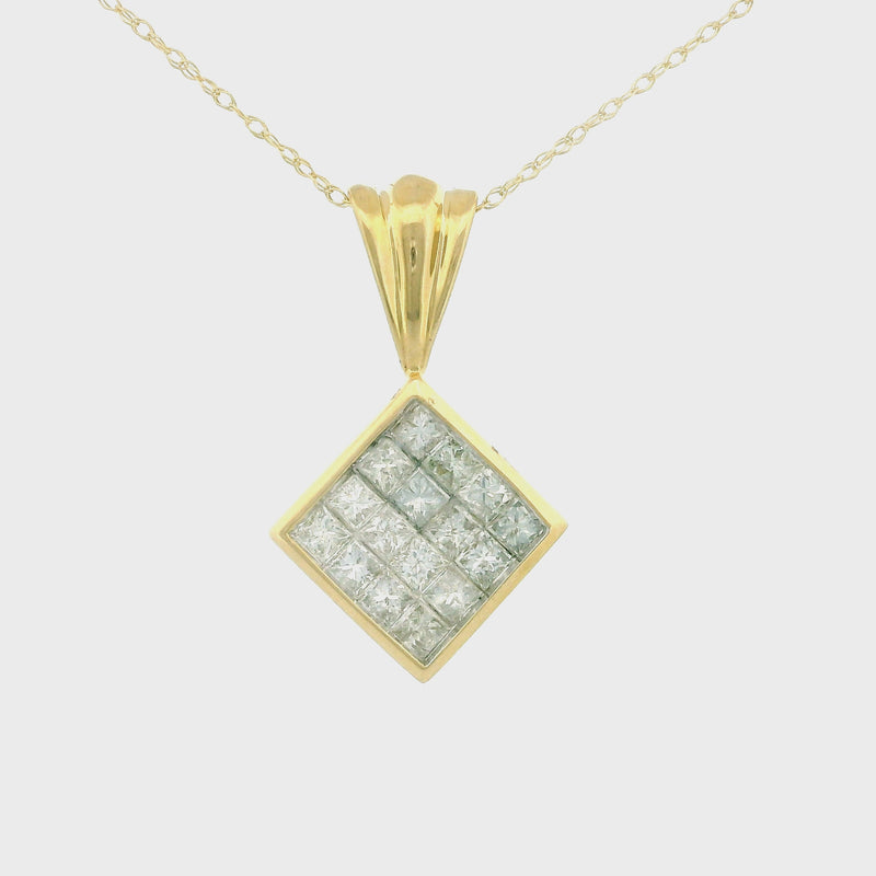 This Diamond Pendant is crafted in 18K Yellow Gold and set with 1.10ct of natural diamonds for a brilliant, luxurious sparkle. With a 1-inch by 0.6-inch design and 2.2g weight (chain not included), it adds timeless elegance and sophistication to any look.